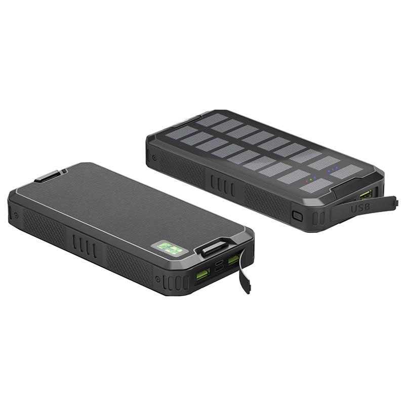 Den er udstyret med et solidt batteri med en kapacitet på 20000mAh og et solcellepanel, hvilket gør den ideel til opladning af dine enheder udendørs. Du kan reducere opladningstiden markant med hurtige opladningsprotokoller såsom USB-C Power Delivery og USB-A Quick Charge 3.0. Powerbanken har også en LED lommelygte, som er et ideelt tilbehør til campister og vandrere.