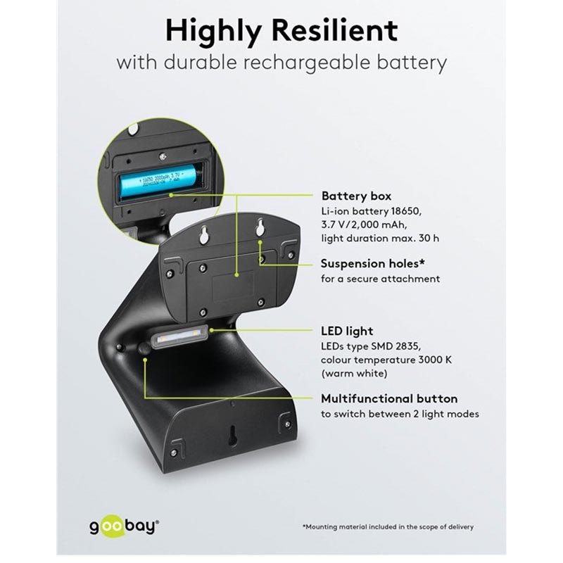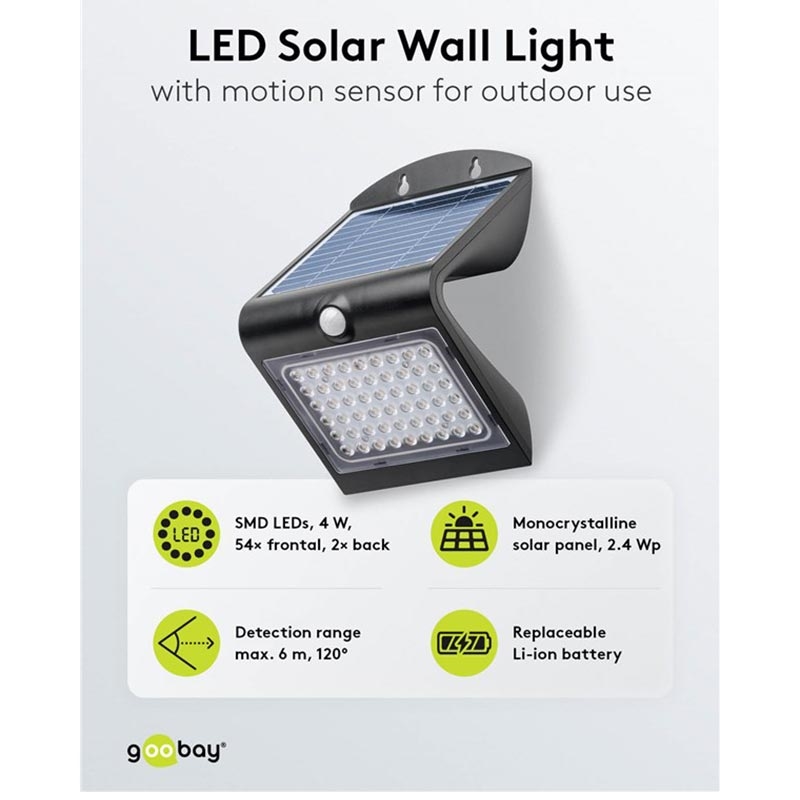 Goobay LED-solvægslampe 4W med PIR-bevægelsessensor - IP65 vandtæt udendørs solcellelampe (500 lm, 4000K) - udskifteligt batteri