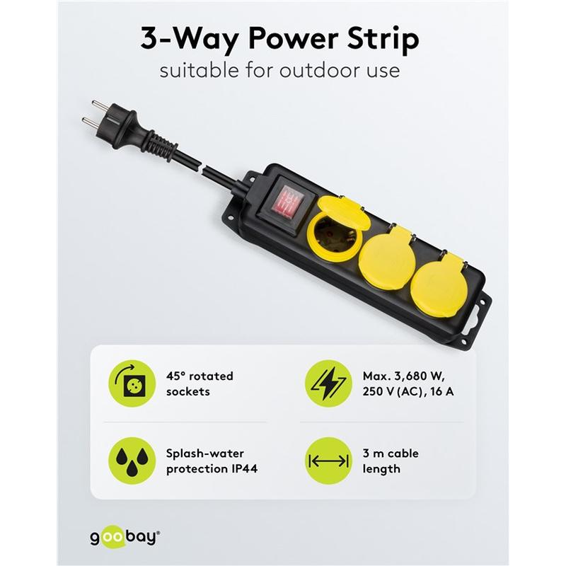 Goobay 3-vejs udendørs strømskinne med 3m kabel - pålidelig ydeevne til indendørs og udendørs brug