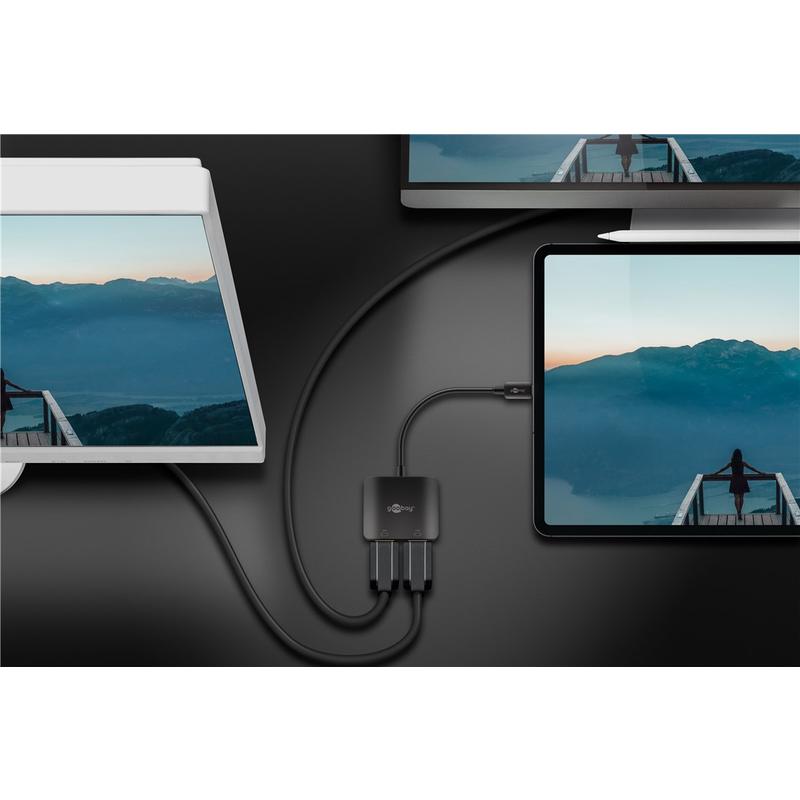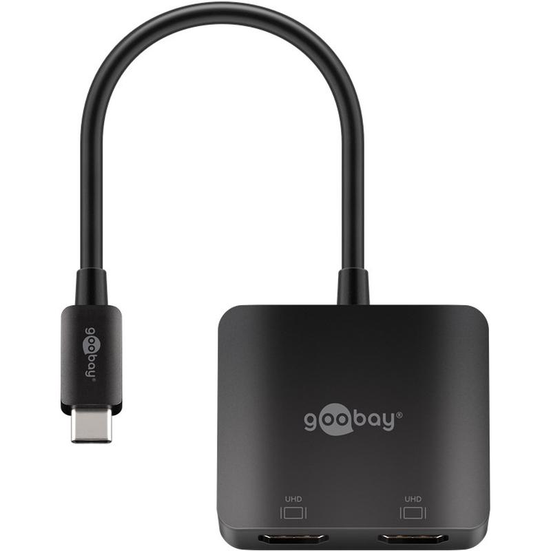 Adapter til flere monitorer til at spegla data, lyd- og videosignaler fra USB-C™ til op til 2 HDMI™-porte, Möjliggør t.ex. synkronisering af op til 2 skærme samtidigt via HDMI™, Lämplig for værdidatorer med USB-C™-kontakt, Navet understøtter maksimale skærmopløsninger på 2x 4K @ 60 Hz i MST-läge under Windows, I SST-läge (Single Stream Transport) macOS-støtter op til 2 x 4K @ 60 Hz, Tack vare Plug & Play kan opdeles uden at installere driver. Stødjer HDR (High Dynamic Range) til billeder med høj kontrast samt HDCP 1.4 og 2.2 til beskyttet signaloverførsel