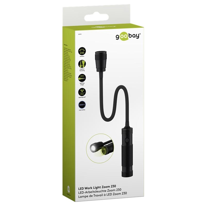 Udstyret med en magnet i bunden og et 33 cm langt fleksibelt kabel, er Goobay Zoom 230 LED arbejdslyset en praktisk gadget, når du har brug for lys og begge hænder fri. Juster lyskeglen med en glidemekanisme for mere effektivt retningsbestemt lys. Goobay Zoom 230 fungerer med tre LR03 AAA-batterier (medfølger ikke).