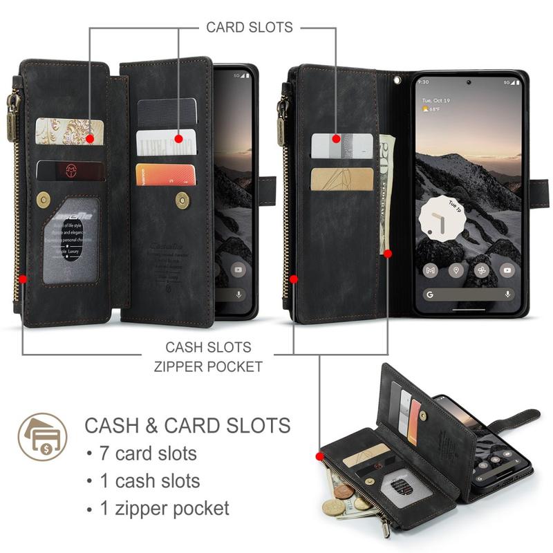 En Caseme C30 multifunktionel pung til Google Pixel 10, Pixel 10 Pro giver en enestående all-around beskyttelse, og et eksklusivt, raffineret design. Dette elegant cover er lavet af førsteklasses polyurethan, forstærket af et stødabsorberende TPU indercover, der slutter sig perfekt omkring din Google Pixel 10, Pixel 10 Pro. Samtidig er Caseme C30 pungen forbedret med adskillige kortholdere, et stort rum til penge indeni, og en lynlåslomme udenpå, som alle er beskyttet af en sikker magnetisk lukning.