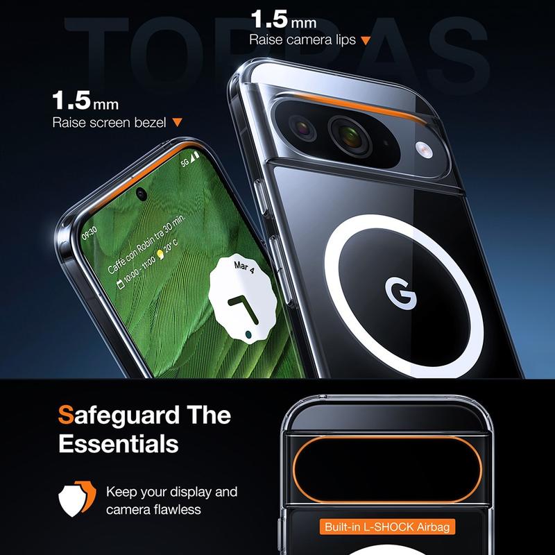 Torras MagSafe-kompatible gennemsigtige TPU-etui til Google Pixel 9, Pixel 9 Pro kombinerer stil, beskyttelse og funktionalitet, hvilket gør det til det perfekte valg for brugere, der ønsker et slankt, holdbart etui, der fremhæver telefonens design og samtidig tilbyder MagSafe-komfort.