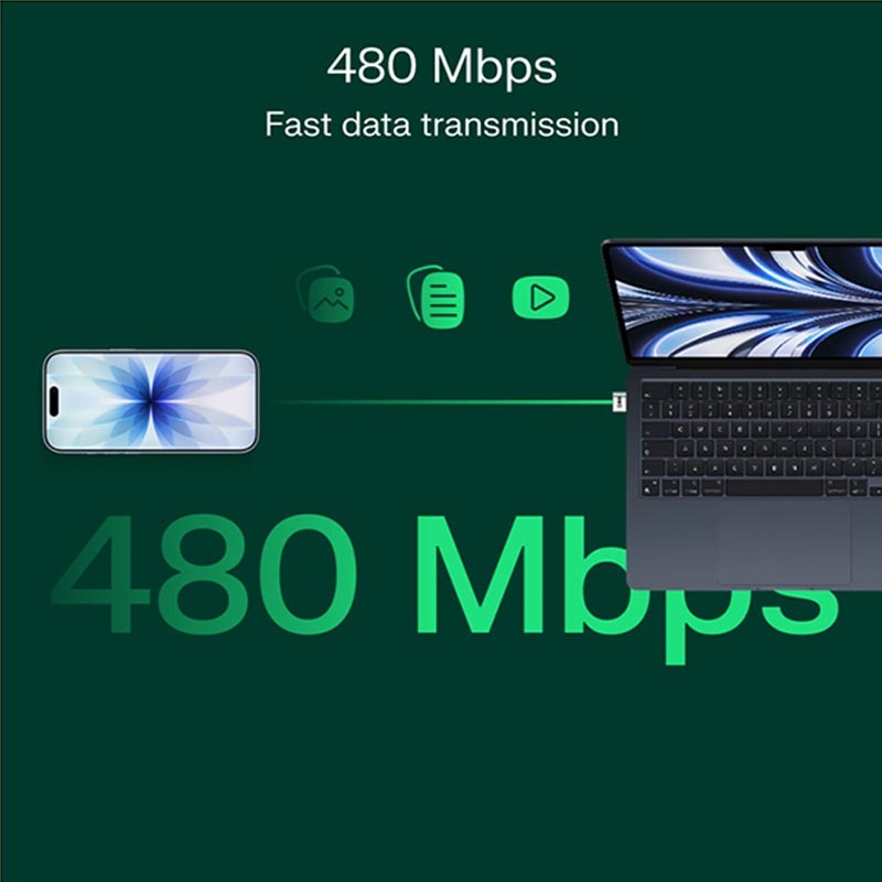 - Hurtig dataoverførsel - Understøtter 480Mbps overførselshastighed, hvilket muliggør hurtig og effektiv filoverførsel mellem enheder som smartphones, tablets og bærbare computere.