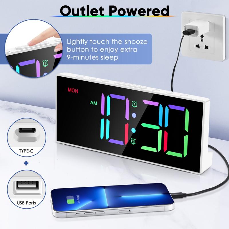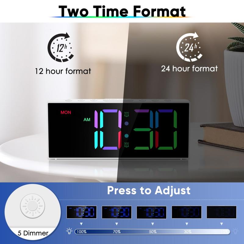 GS-G11 RGB Digital Alarm Clock er et moderne bordur designet til soveværelser, stuer og skriveborde, hvor klar synlighed og nem betjening er vigtigt. Det levende LED-display tilbyder flere RGB-farvetilstande, mens justerbar lysstyrke og lydstyrke giver dig mulighed for at tilpasse uret til dit rum og din rutine. Med dobbelt alarm, en praktisk snooze-funktion og hukommelsesbackup i tilfælde af strømafbrydelser er det et praktisk ur til hverdagsbrug, der også tilføjer en stilfuld glød til dit rum.