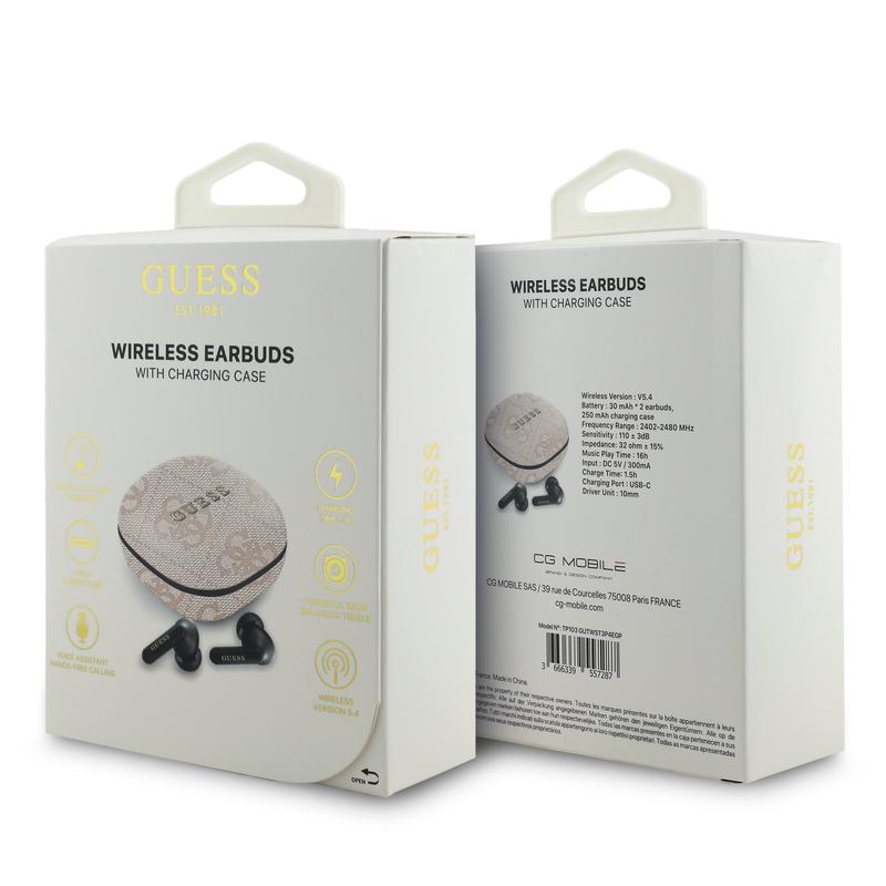 Guess 4G Script Logo ENC TWS Earphones tilbyder Guess' sofistikerede signatur kombineret med avanceret trådløs lydteknologi. Nyd krystalklar lyd, støjfrie opkald og et ubesværet stilfuldt look i alle omgivelser.