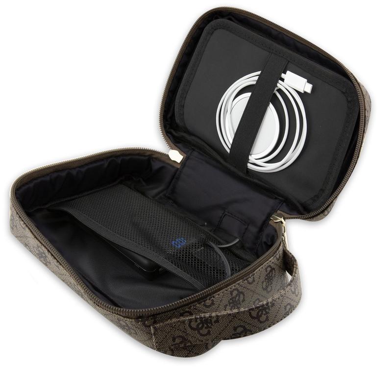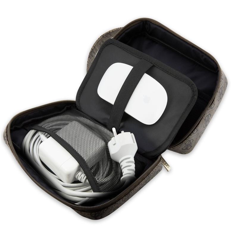 Guess Travel Universal-tasken er den ideelle rejsekammerat for alle, der leder efter en stilfuld og praktisk måde at bære alt deres tilbehør til telefon, tablet eller laptop på. Tasken er lavet af ECO-læder i høj kvalitet og har en fint struktureret overflade prydet med det ikoniske Guess-logo. Indvendigt giver de veludformede lommer rigelig plads til opladere, powerbanks og strømkabler. Det mest iøjnefaldende ved denne taske er USB-A-udgangen, så du kan tilslutte en powerbank og oplade din telefon direkte fra siden af tasken. Med et rent design og en sans for stil er denne taske perfekt til rejsende, der sætter pris på funktionalitet og mode.