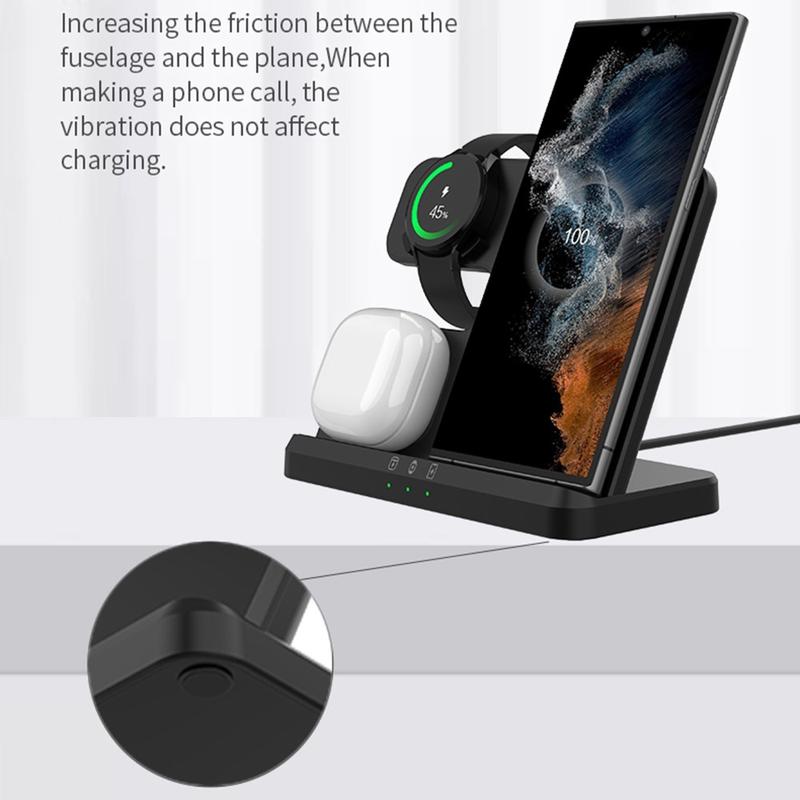 Hvis du er på udkig efter en multifunktionel trådløs ladestation til Samsung Galaxy, er denne 3-i-1 trådløse oplader det, du har brug for. Den er kompatibel med Samsung Galaxy S22, S21, S20, S10, Ultra, Note, Galaxy Watch 5, 4 og Active Buds m.fl.