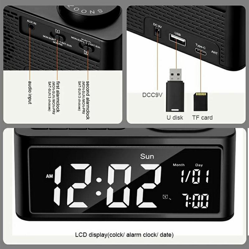 - Dobbelte alarmer, der kan tilpasses: Indstil to separate alarmer med valg af indbyggede ringetoner, FM-radio eller USB-musikafspilning. Inkluderer en alarmindstilling, der kun gælder på hverdage, for skræddersyet bekvemmelighed.