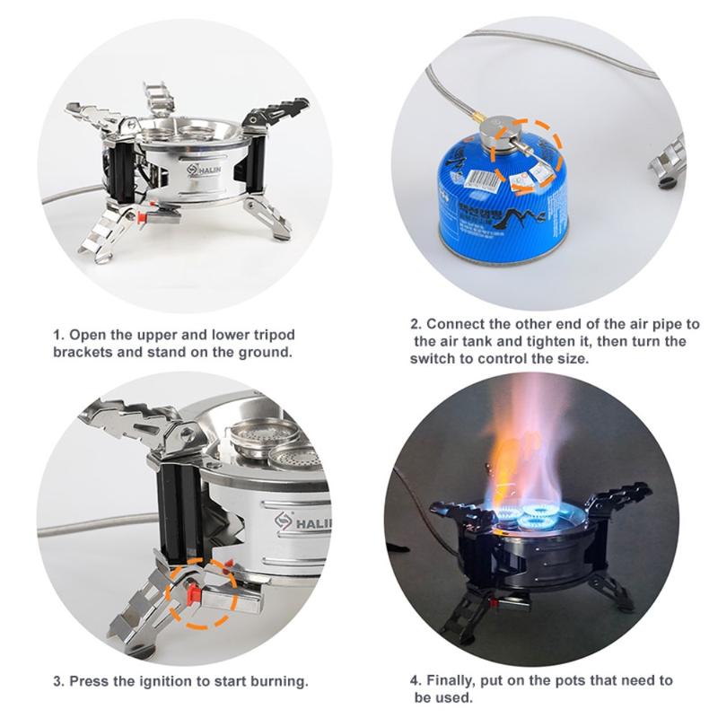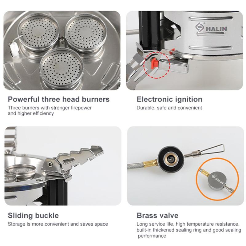 Halin Outdoor Portable Gas Stove i rustfrit stål er en holdbar og praktisk madlavningsløsning til udendørs aktiviteter. Den elektroniske tænding giver en sikker og nem måde at starte komfuret på, mens det glidende spænde giver mulighed for praktisk opbevaring og pladsbesparelse. Messingventilen sikrer en lang levetid og høj temperaturbestandighed med en indbygget fortykket tætningsring for god tætningsevne. Med en effekt på 11800 W og en kogetid på ca. 2-3 minutter er dette komfur et effektivt og pålideligt valg til udendørs madlavning.