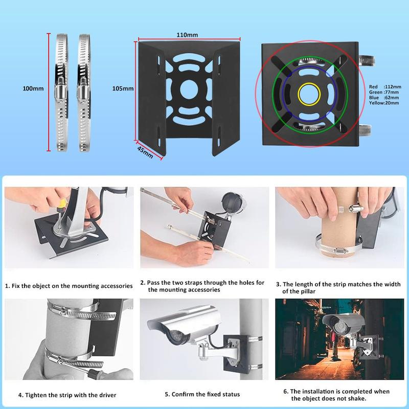 Beslaget understøtter flere monteringshulsafstande (112 mm / 77 mm / 62 mm / 20 mm), hvilket gør det kompatibelt med en bred vifte af CCTV- og overvågningskameramodeller. Denne alsidighed sikrer nem integration i eksisterende sikkerhedsopsætninger.