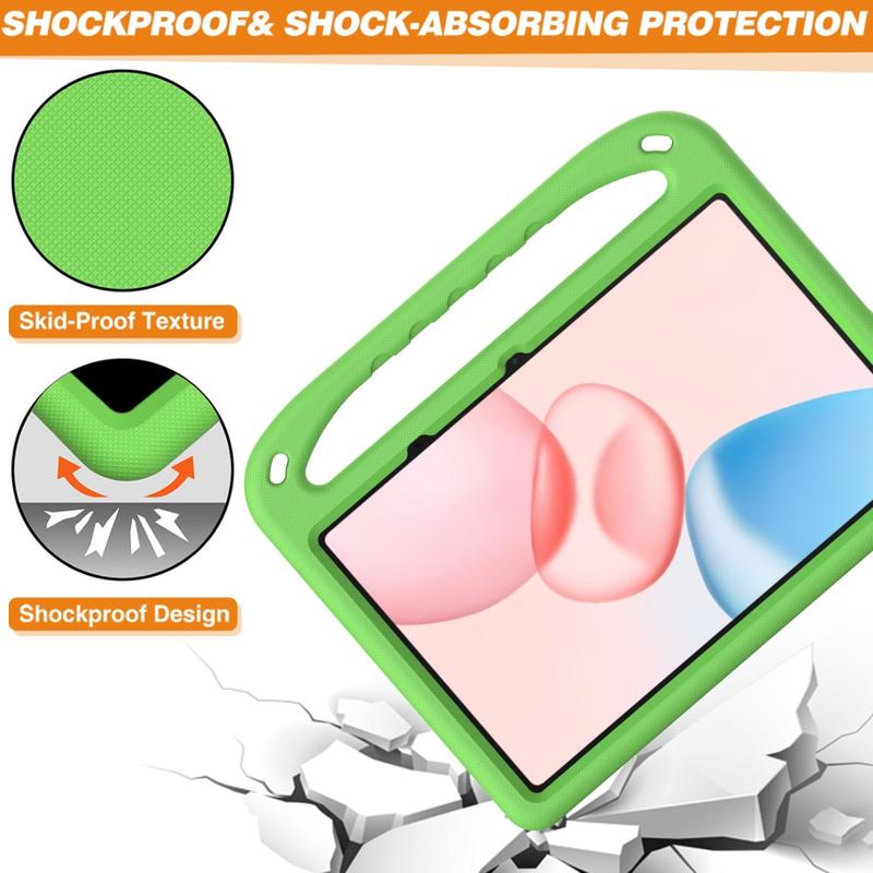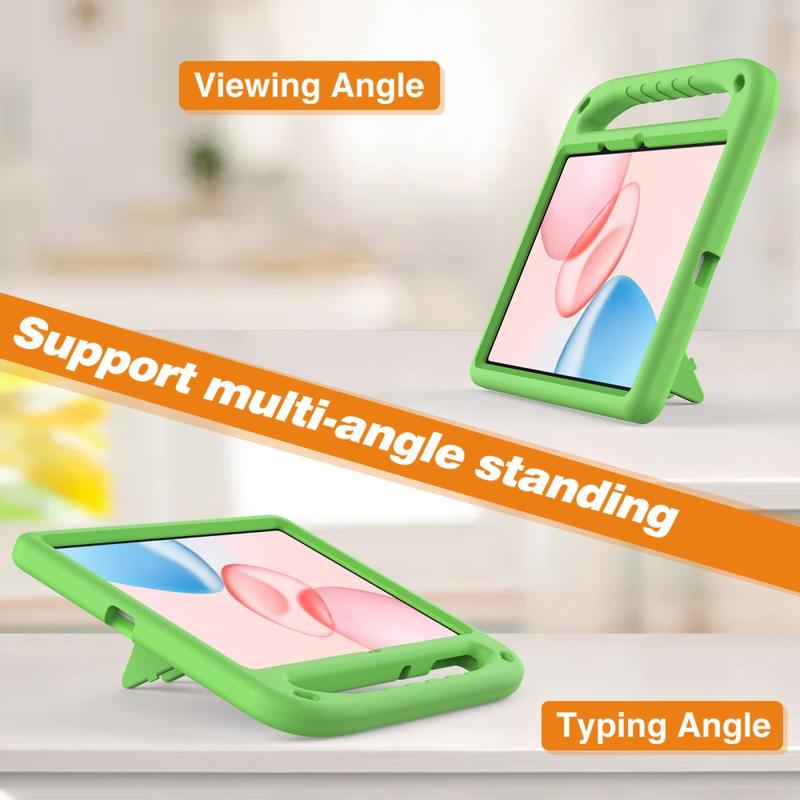 Det er lavet af slagfast, miljøvenligt og ikke-giftigt EVA-materiale, som forstærker hjørnerne, samtidig med at den hævede ramme omkring skærmen beskytter mod ridser og slag. Bagsiden af coveret har en kickstand, som muliggør komfortable og håndfrie oplevelser, alt imens bærehåndtaget gør coveret endnu mere praktisk og spændende for børnene.