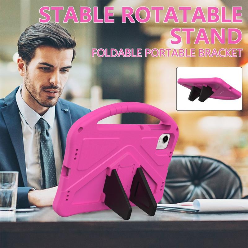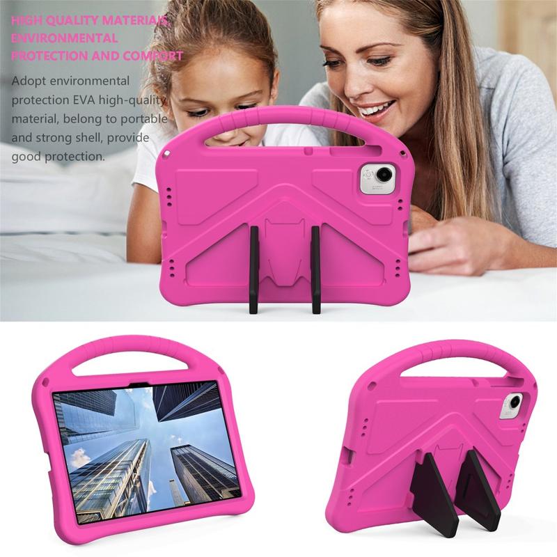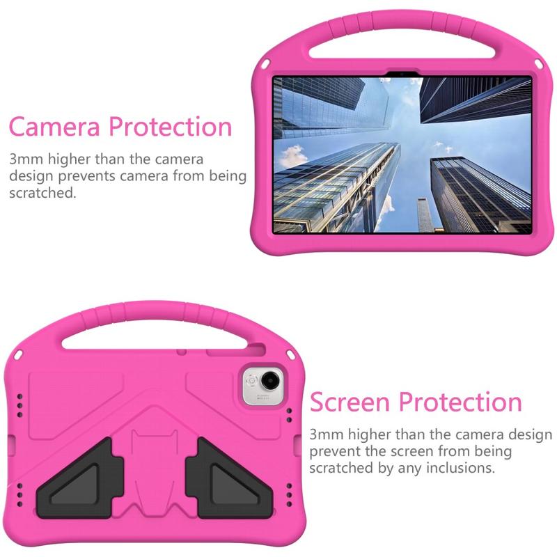 Det er lavet af slagfast, miljøvenligt og ikke-giftigt EVA-materiale, som forstærker hjørnerne, samtidig med at den hævede ramme omkring skærmen beskytter mod ridser og slag. Bagsiden af coveret har en kickstand, som muliggør komfortable og håndfrie oplevelser, alt imens bærehåndtaget gør coveret endnu mere praktisk og spændende for børnene.