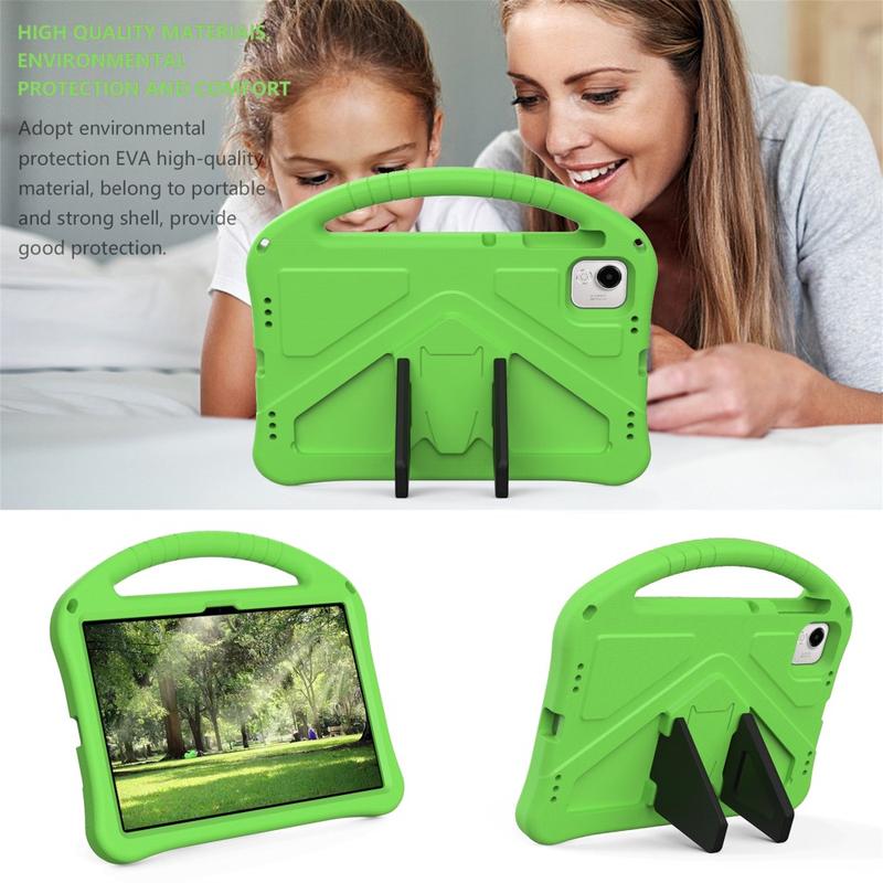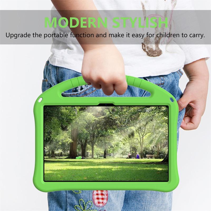 Det er lavet af slagfast, miljøvenligt og ikke-giftigt EVA-materiale, som forstærker hjørnerne, samtidig med at den hævede ramme omkring skærmen beskytter mod ridser og slag. Bagsiden af coveret har en kickstand, som muliggør komfortable og håndfrie oplevelser, alt imens bærehåndtaget gør coveret endnu mere praktisk og spændende for børnene.