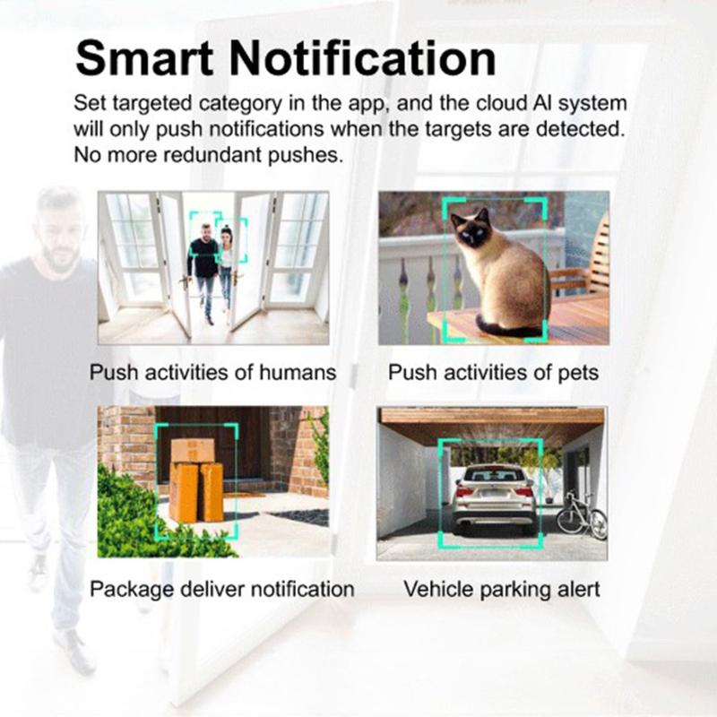 - Smarte AI-advarsler. Genkendelse af mennesker, kæledyr, biler, pakker og en justerbar hegnszone holder notifikationer relevante.