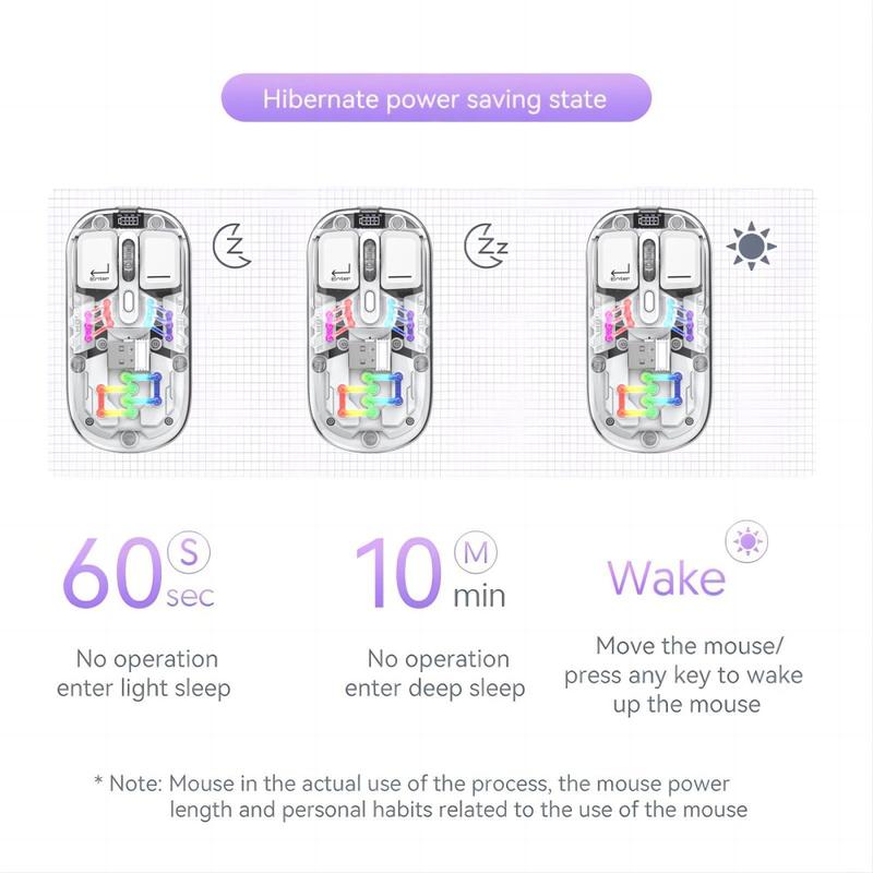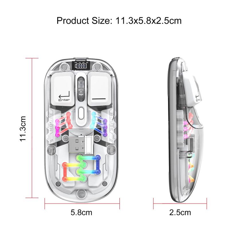 HXSJ T200 Wireless Bluetooth Mouse tilbyder dobbelt tilslutning via Bluetooth og 2,4 GHz trådløs, hvilket understøtter samtidige tilslutninger til to enheder. Denne mus er fremstillet af gennemsigtigt pc-materiale med RGB-belysning, der kan tilpasses, og giver et avanceret udseende og overlegen funktionalitet. Med justerbar DPI (800/1200/1600), et langtidsholdbart genopladeligt batteri på 400 mAh og et slankt ergonomisk design sikrer den præcis og jævn betjening. Musen er ideel til både arbejde og spil og forbedrer effektiviteten og komforten med lydløse klik og levende belysning.