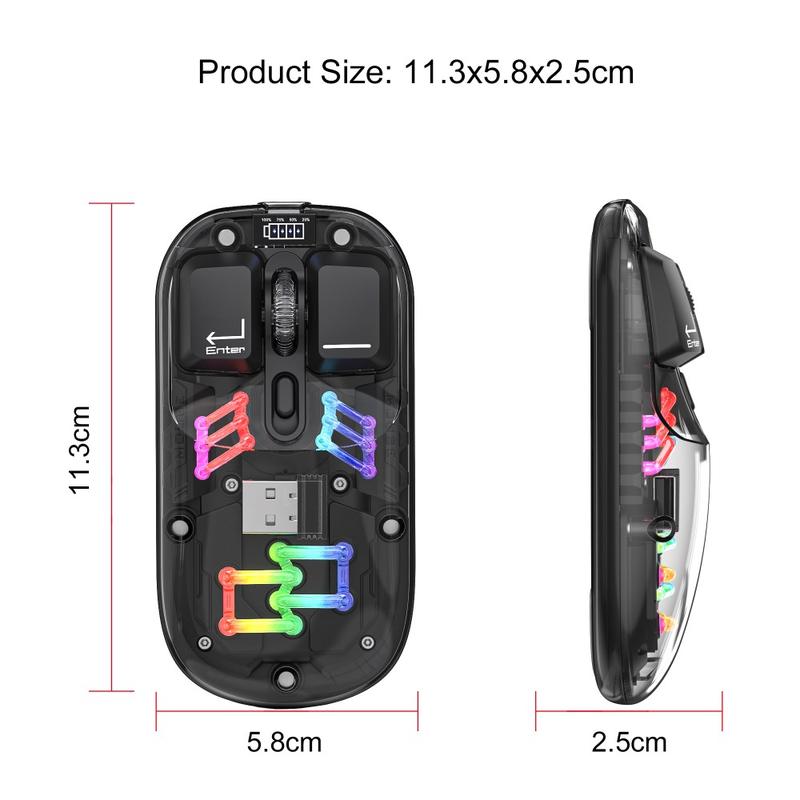 HXSJ T200 Wireless Bluetooth Mouse tilbyder dobbelt tilslutning via Bluetooth og 2,4 GHz trådløs, hvilket understøtter samtidige tilslutninger til to enheder. Denne mus er fremstillet af gennemsigtigt pc-materiale med RGB-belysning, der kan tilpasses, og giver et avanceret udseende og overlegen funktionalitet. Med justerbar DPI (800/1200/1600), et langtidsholdbart genopladeligt batteri på 400 mAh og et slankt ergonomisk design sikrer den præcis og jævn betjening. Musen er ideel til både arbejde og spil og forbedrer effektiviteten og komforten med lydløse klik og levende belysning.