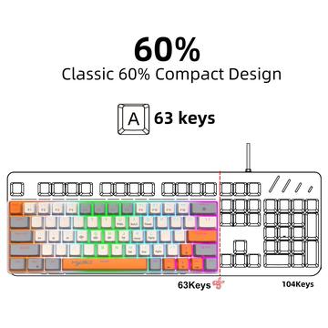 Minidesign, der sparer plads: Mini-designet på dette mekaniske tastatur med 63 taster er både let og bærbart, hvilket gør det til en perfekt løsning for brugere med begrænset plads på skrivebordet. Det giver ikke kun en behagelig inputoplevelse, men sparer også effektivt værdifuld plads på skrivebordet.