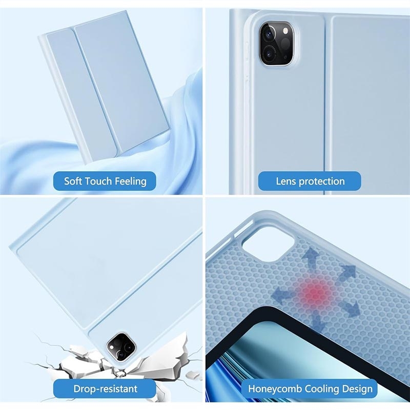 Gør din iPad Air 13 2026/2025/2024, iPad Pro 12.9 2022/2021/2020/2018 endnu bedre med et Bluetooth-tastaturetui, et multifunktionelt 2-i-1-tilbehør, der kombinerer beskyttelse, produktivitet og stil. Dette elegante etui er fremstillet af førsteklasses polyrethan og giver fuld beskyttelse mod ridser, stød og fingeraftryk, samtidig med at det bevarer et professionelt udseende. Bluetooth-tastaturet forbindes trådløst, så du kan skrive jævnt og hurtigt, mens den integrerede touchpad understøtter multigestusstyring, så du kan navigere ubesværet. Tastaturet er baggrundsbelyst, så du kan skrive komfortabelt selv i omgivelser med svagt lys. Den indbyggede justerbare stander giver en ergonomisk synsvinkel, som gør den perfekt til at skrive, streame eller læse. Dette tastaturetui er designet til forretningsbrug, rejser eller hverdagsbrug og forvandler din tablet til en bærbar arbejdsstation.