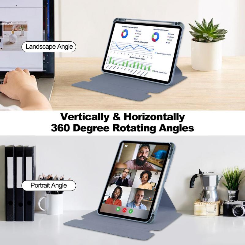 Roterende tablet-etuier blev populære, da enhedernes skærme blev større og mere uundværlige til hverdagens opgaver. Den 360° drejning giver ergonomiske fordele og hjælper dig med at opnå den ideelle vinkel til at se og skrive. Derudover minimerer dette design nakkebelastningen ved at lade dig placere skærmen i den mest behagelige højde og retning, hvilket forbedrer din samlede tabletoplevelse.