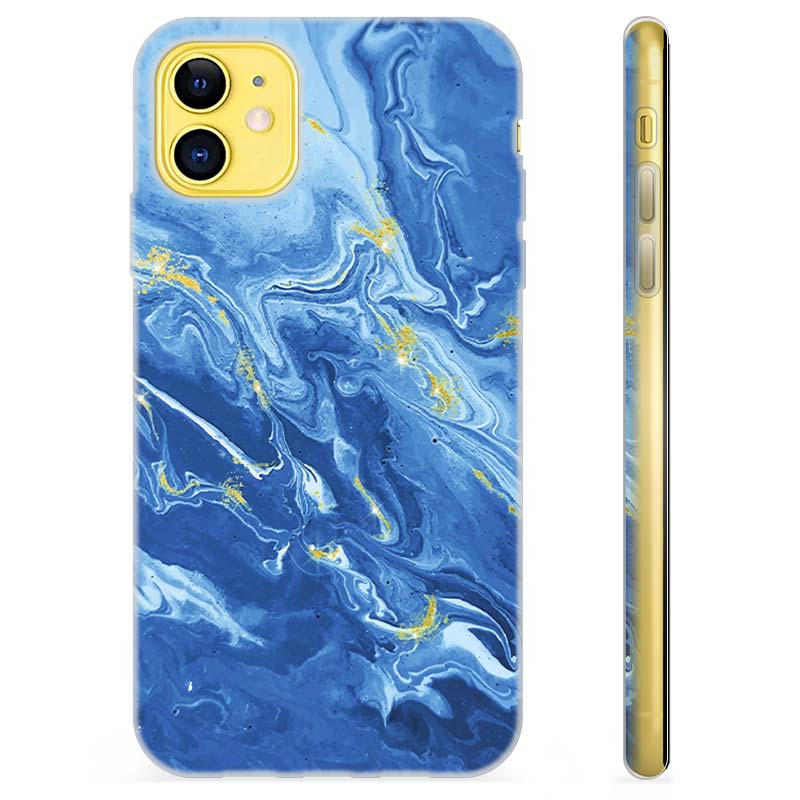 Dette iPhone 11 TPU Cover er udsmykket med et farvestrålende marmormønster, der vil tiltrække opmærksomhed og tilføje en unik stil til din smartphone. Fremstillet af holdbart og fleksibelt termoplastisk polyuretan, sikrer dette cover at din iPhone er beskyttet mod dagligdagens stød, ridser og små fald. Designet er ikke blot praktisk, men også æstetisk tiltalende med sin glatte overflade og det levende marmormønster med blå og gyldne nuancer, der efterligner udseendet af naturlig marmor.