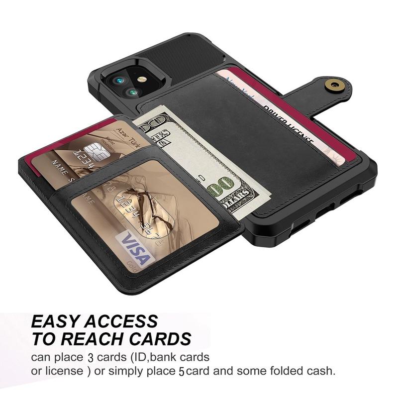 - iPhone 12, iPhone 12 Pro cover med kortholder har en sikkerheds lukkeknap, pung-design og adskillige kortlommer med en speciel lomme til kontanter