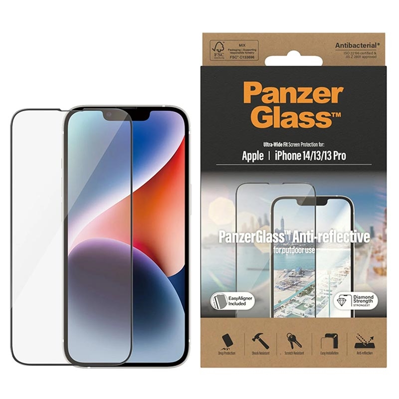 PanzerGlass Ultra-Wide Fit Anti-Reflective EasyAligner AntiBacterial Hærdet Glas til iPhone 13, iPhone 13 Pro, iPhone 14