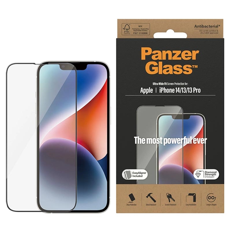 PanzerGlass Ultra-Wide Fit EasyAligner AntiBacterial Hærdet Glas til iPhone 13, iPhone 13 Pro, iPhone 14