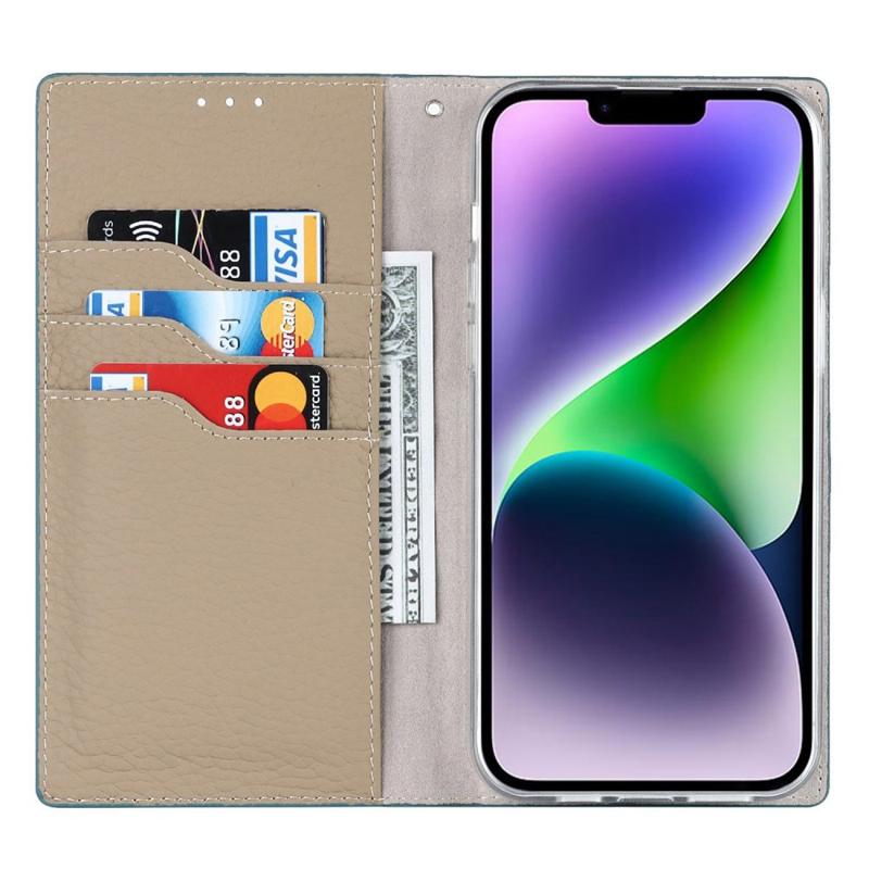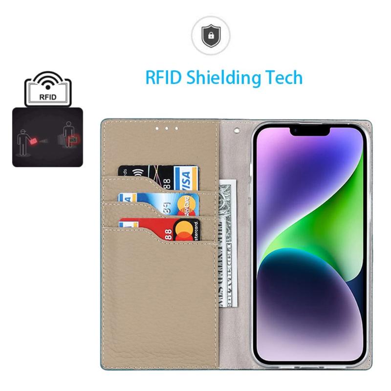 Til iPhone 14 RFID-blokering kortplads Pung telefonetui Litchi Texture ægte læderstativ beskyttelsescover