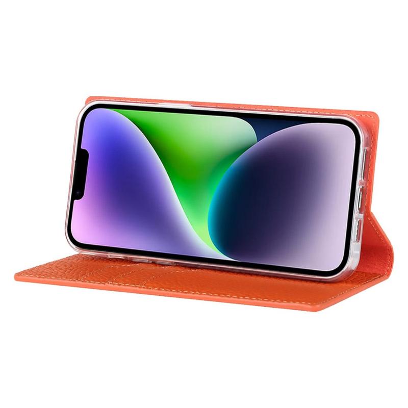 Til iPhone 14 RFID-blokering kortplads Pung telefonetui Litchi Texture ægte læderstativ beskyttelsescover