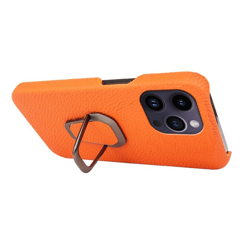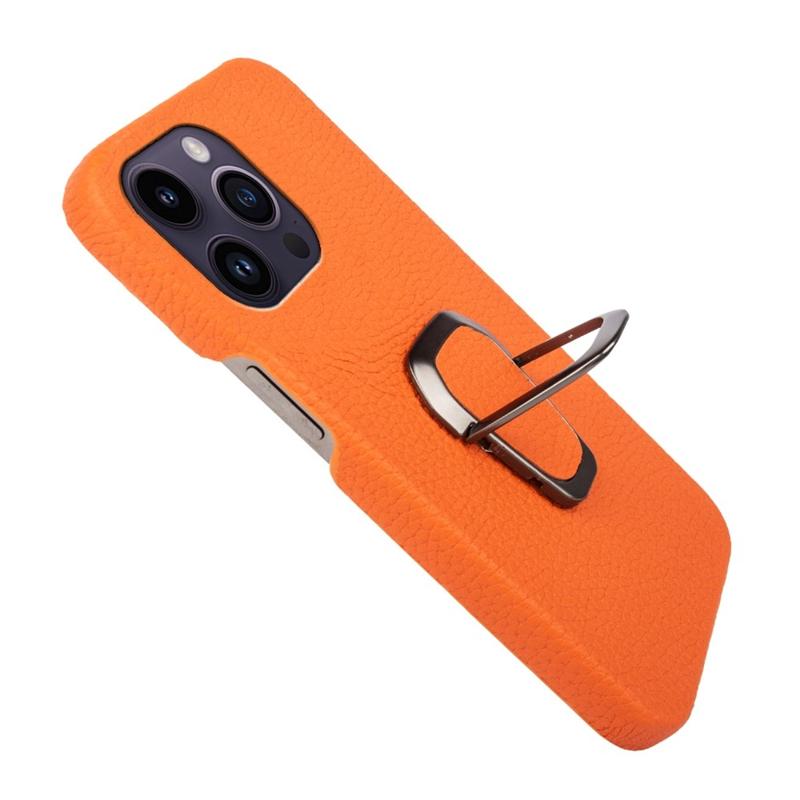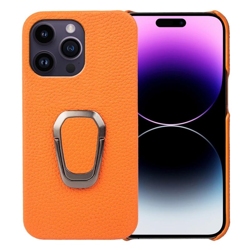 Til iPhone 14 Pro Max ægte læder + hård pc-beskyttende skal Litchi Texture Ring Støttefod Anti-fald telefoncover