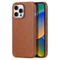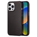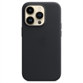 - iPhone 14 Pro læder cover – Et premium valg med naturlig patinering, som gør telefonen mere behagelig at holde i kolde omgivelser. Læderet dæmper stålrammens glatte håndtering.