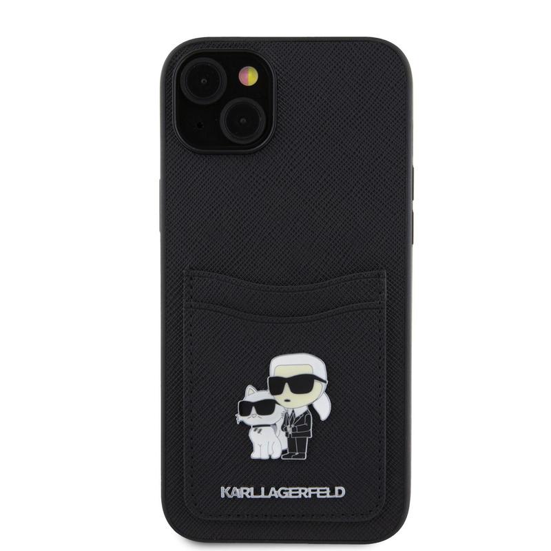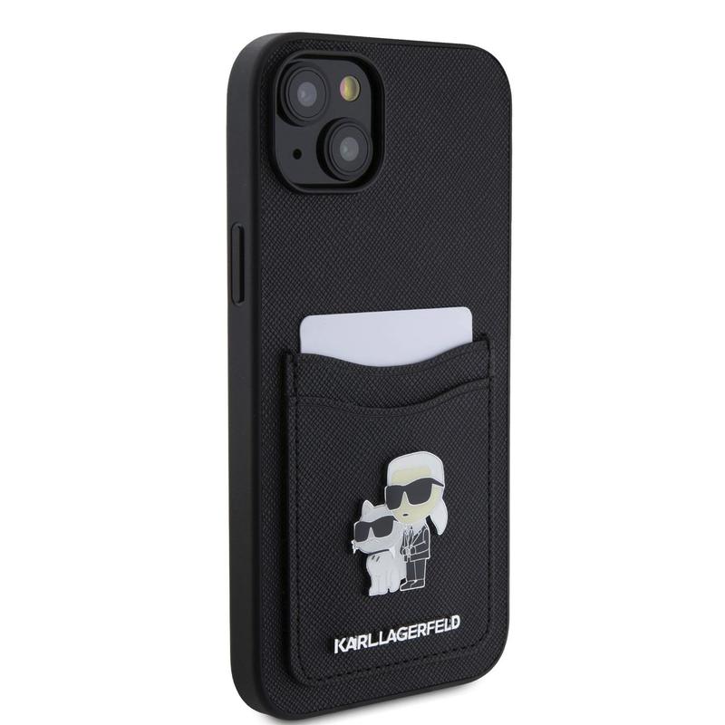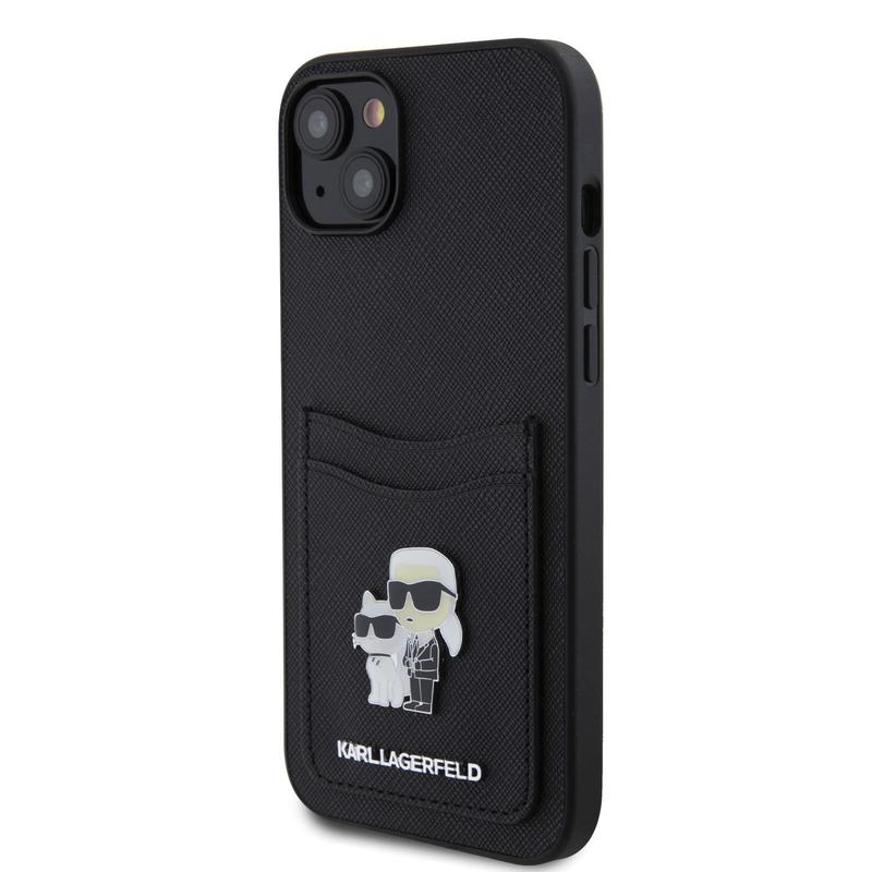 Med iPhone 15 Karl Lagerfeld Saffiano etui med kortlomme i metal Karl & Choupette - sort får du ikke kun et beskyttende cover, men også et stykke modehistorie, der vil gøre din iPhone 15 til et stilfuldt og funktionelt tilbehør.