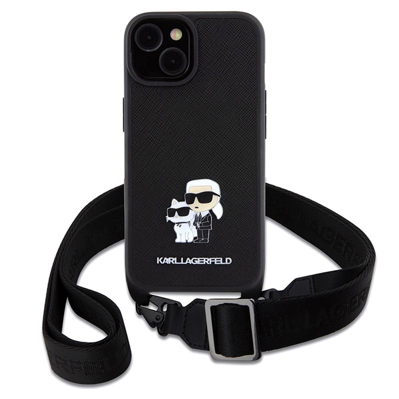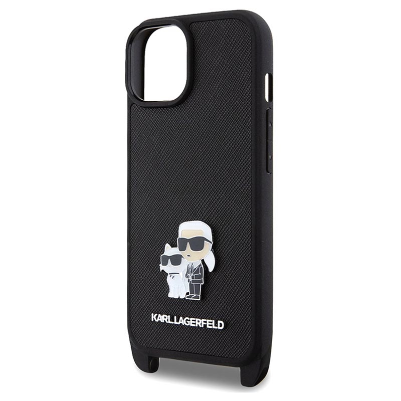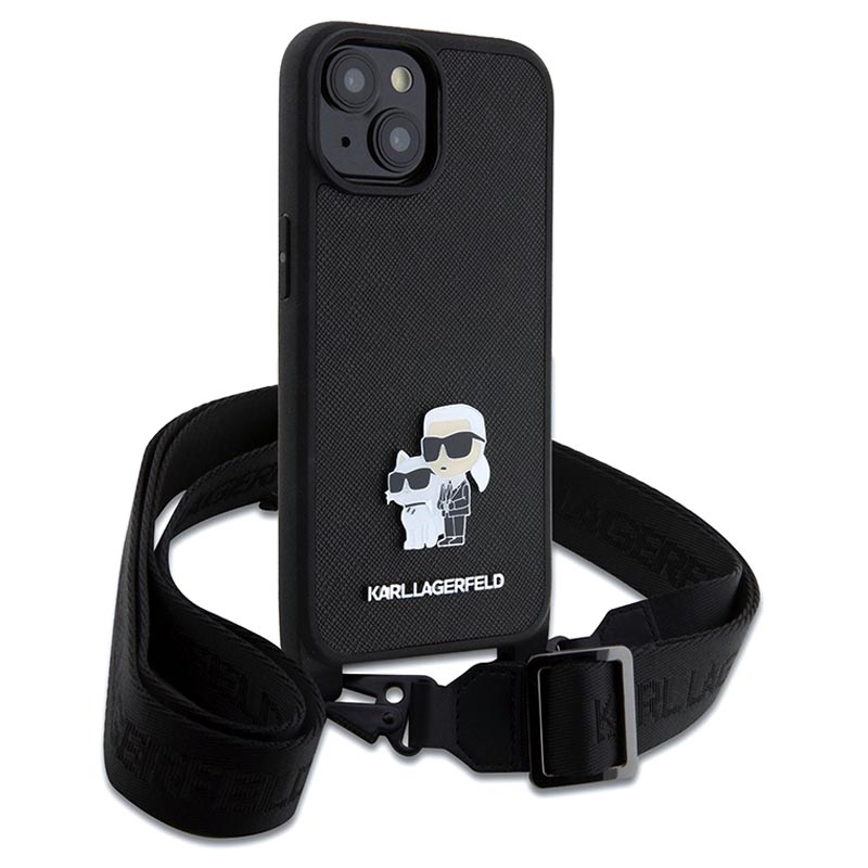 iPhone 15 Karl Lagerfeld Saffiano Crossbody Metal Karl & Choupette Cover - Sort