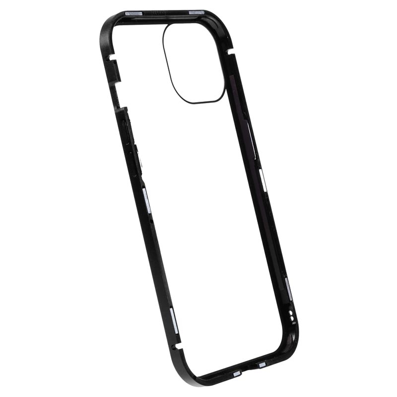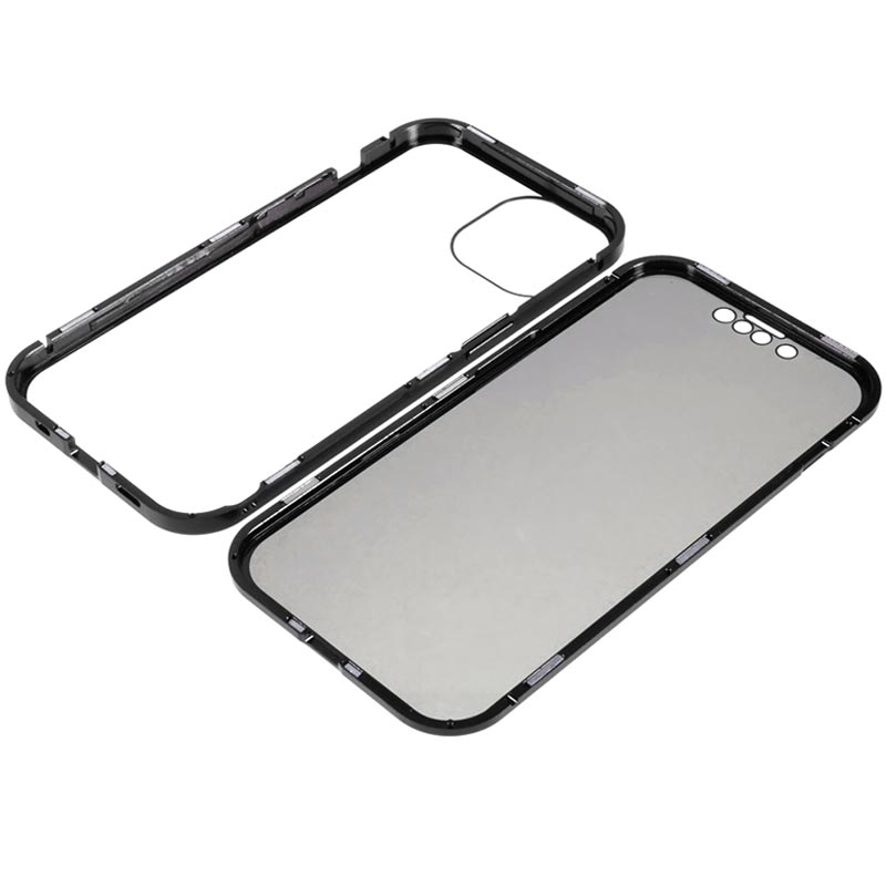 Dobbeltsidet hærdet glas + magnetisk metalramme Anti-Drop Case til iPhone 15 Kompatibel med MagSafe Phone Cover med spændelås - Sort