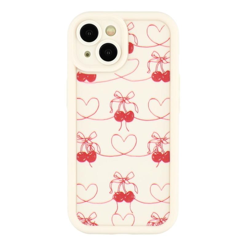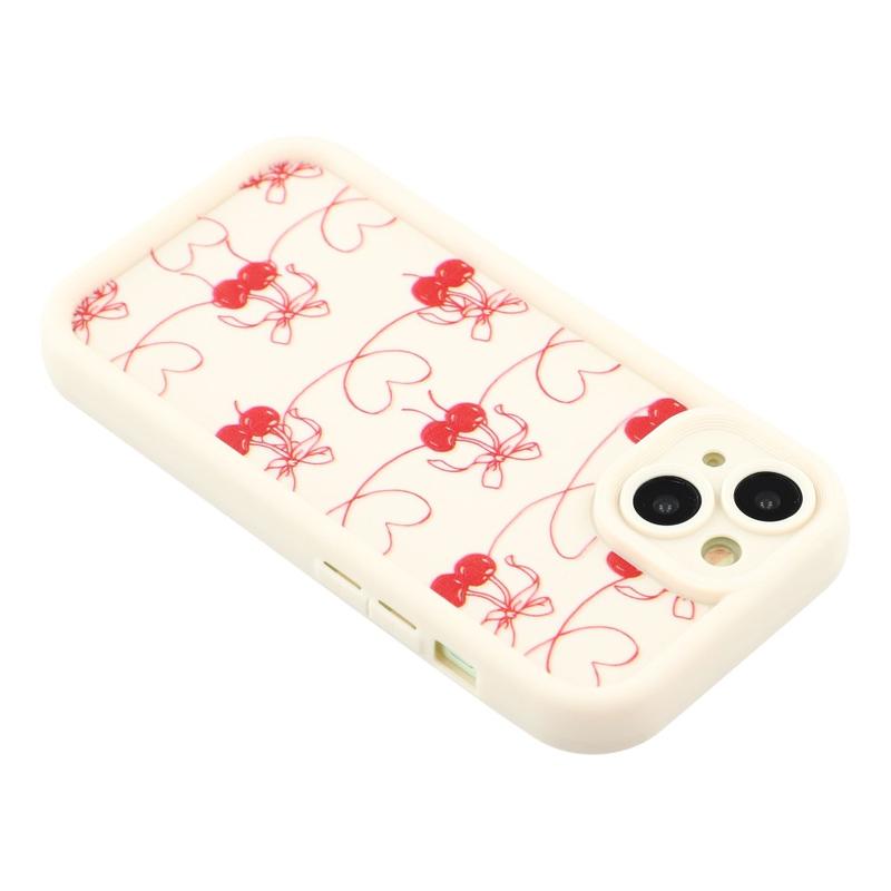 iPhone 15 Plus Stilfuldt stødsikkert TPU cover med forhøjede kanter - hvid / Sløjfebundne kirsebær