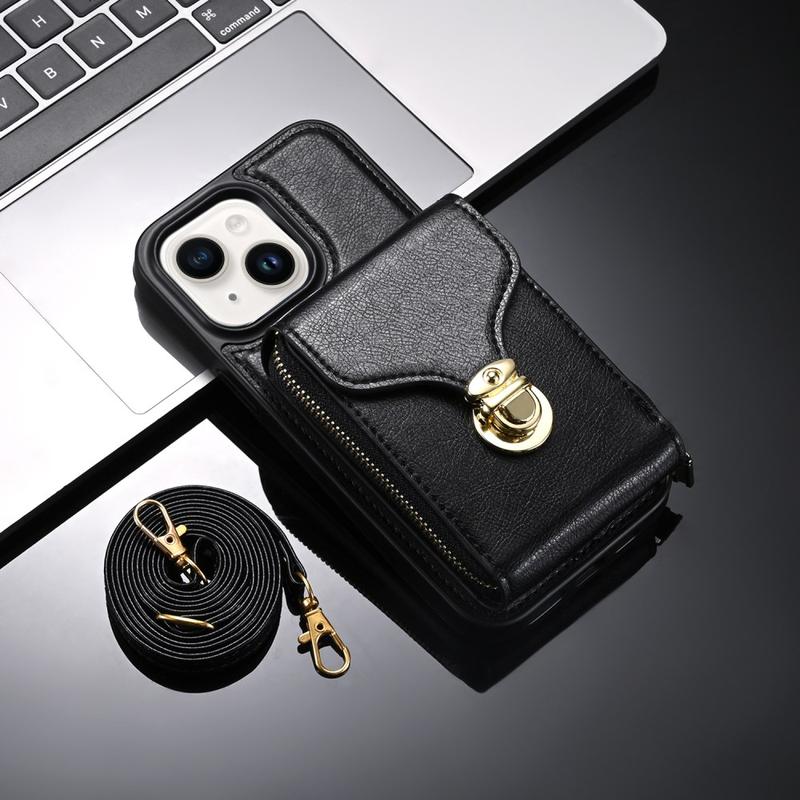 Alt-i-et beskyttende TPU-cover med tegnebog og rem til iPhone 15 Plus