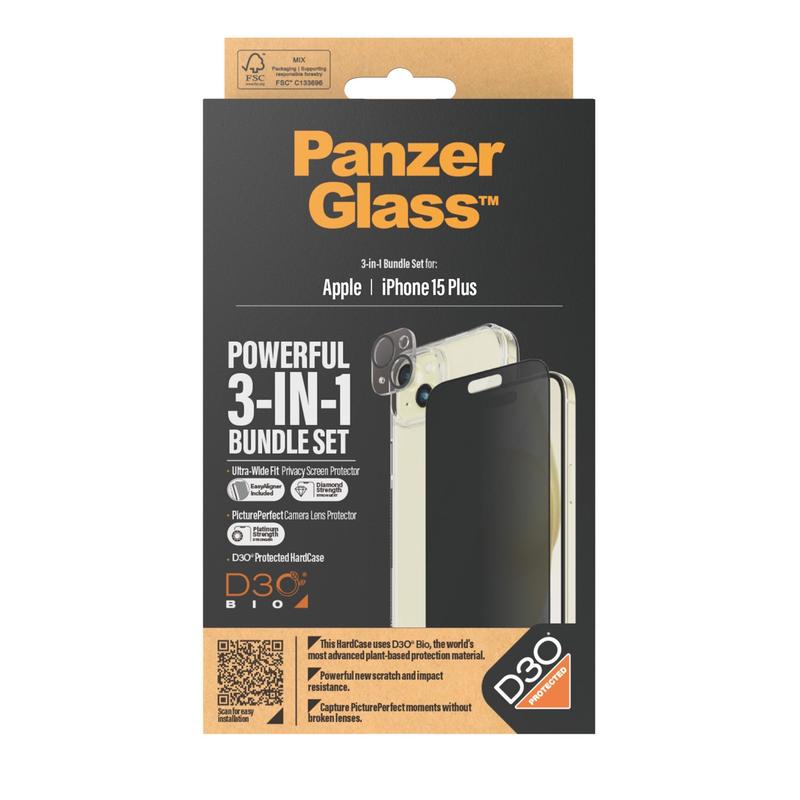 PanzerGlass Privacy 3-i-1-pakke til iPhone 15 Plus - HardCase-cover, PicturePerfect-kameralinsebeskytter, Ultra-Wide Fit Privacy-skærmbeskytter