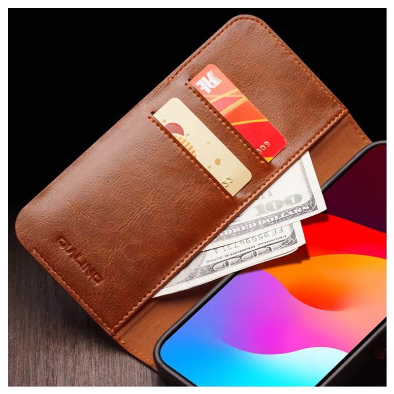 Beskyt din iPhone 15 Plus i en elegant og moderne Qialino classic pung læder taske. Opbevar dine kreditkort, kontanter sammen med din mobil, takket være de integrerede lommer.