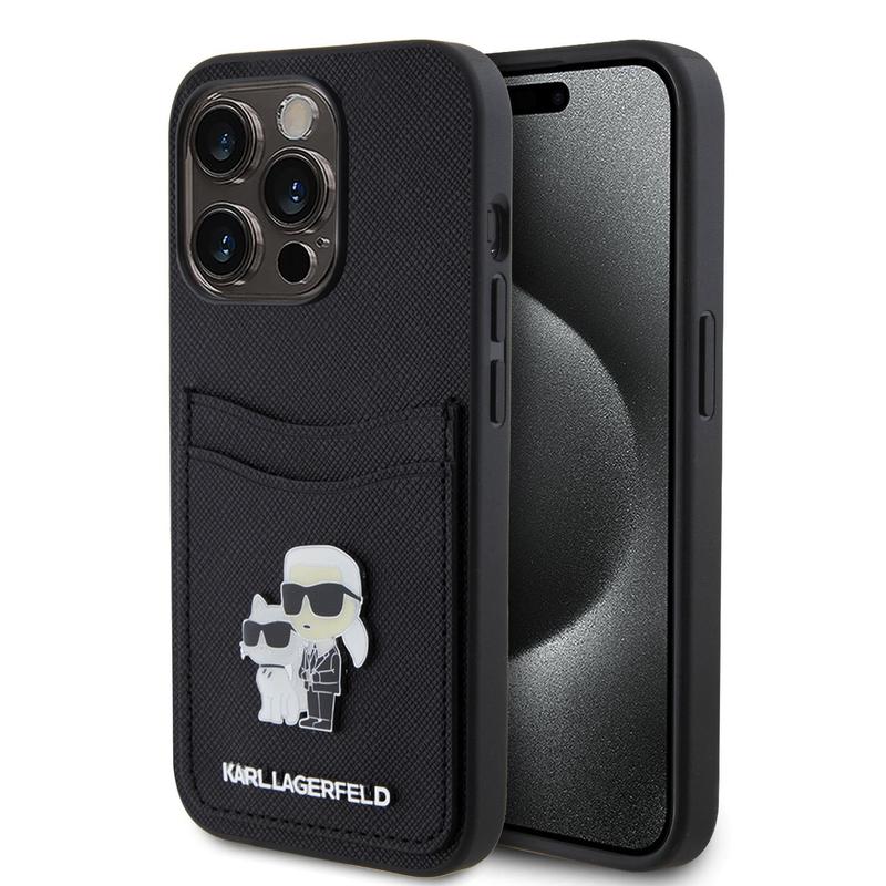 Med iPhone 15 Pro Karl Lagerfeld Saffiano etui med kortlomme i metal Karl & Choupette - sort får du en perfekt balance mellem stil, beskyttelse og funktionalitet. Dette etui er ikke kun et praktisk tilbehør, men også en modeerklæring, der afspejler din personlige stil og smag.