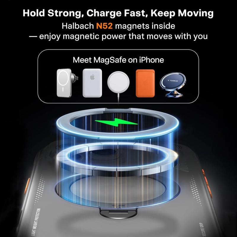 Med Halbach Array-teknologi med førsteklasses N52SH neodymmagneter leverer etuiet op til 200% stærkere magnetisk kraft. Det sikrer pålidelig fastgørelse og opladning med alt MagSafe-tilbehør.