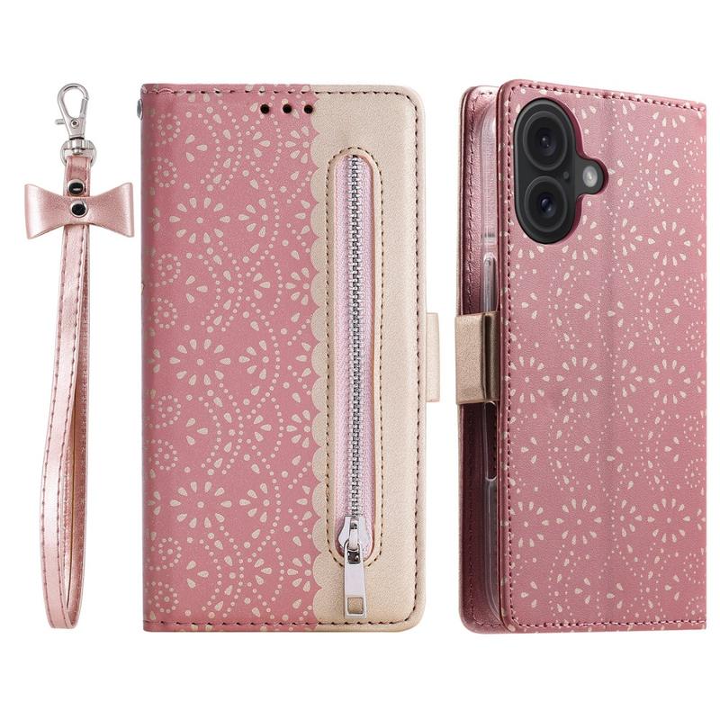 Den utroligt stilfulde pung med kniplinger beskytter din iPhone 16 Plus mod skader, og lynlåslommen foran gør at du kan opbevare dine sedler og mønter.