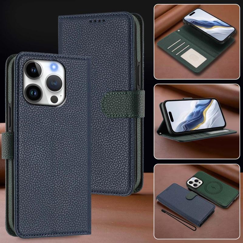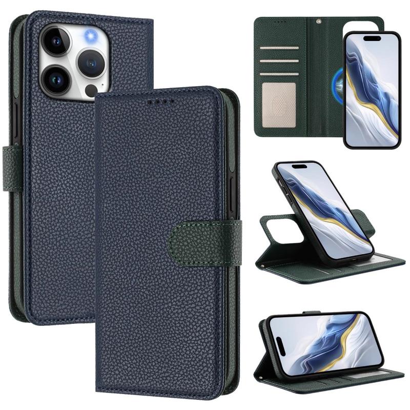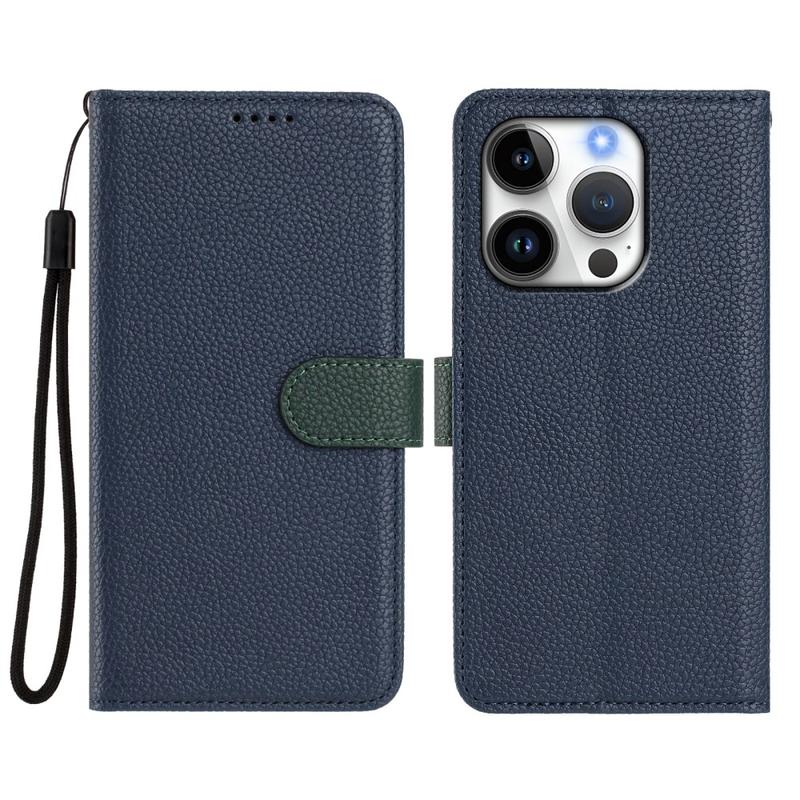 iPhone 16 Pro aftageligt pungetui med MagSafe, RFID-beskyttelse og håndrem - brun / blå