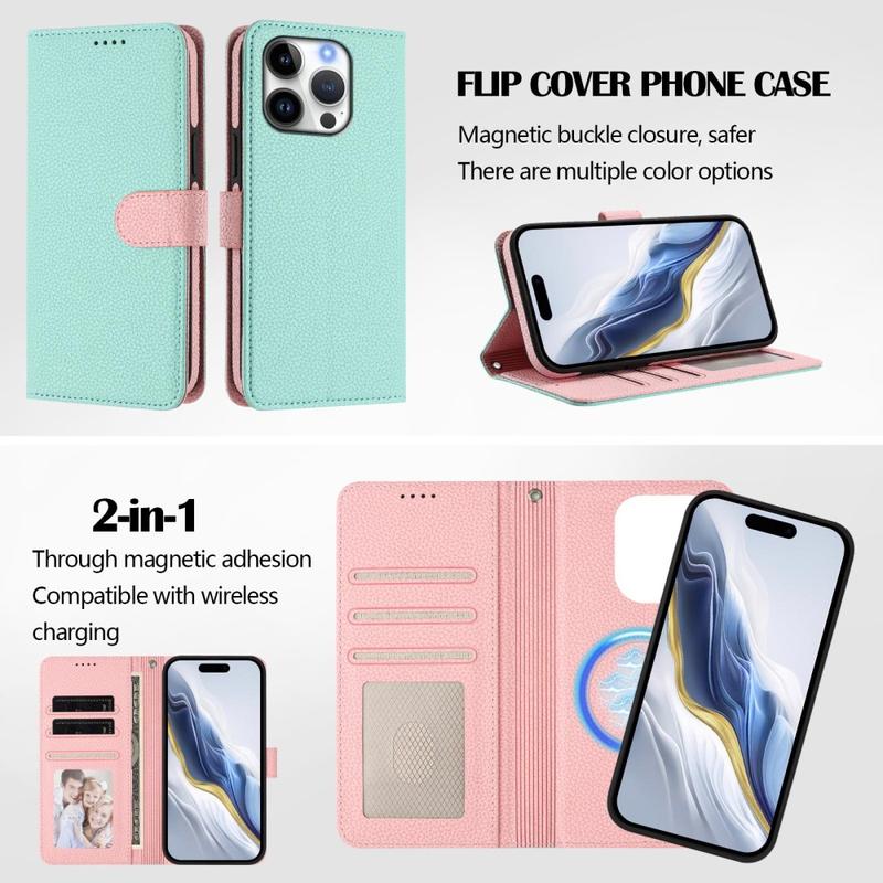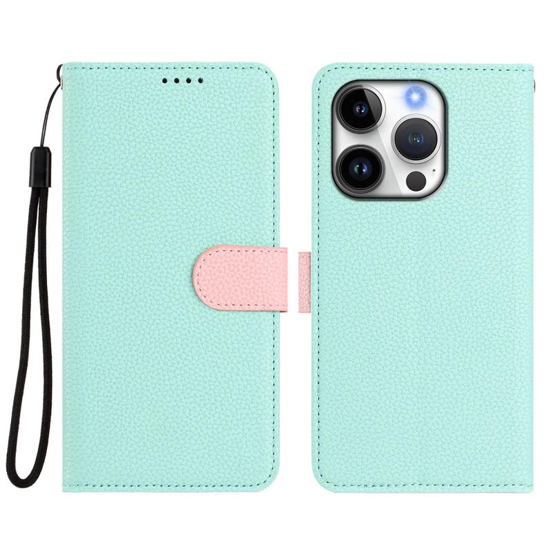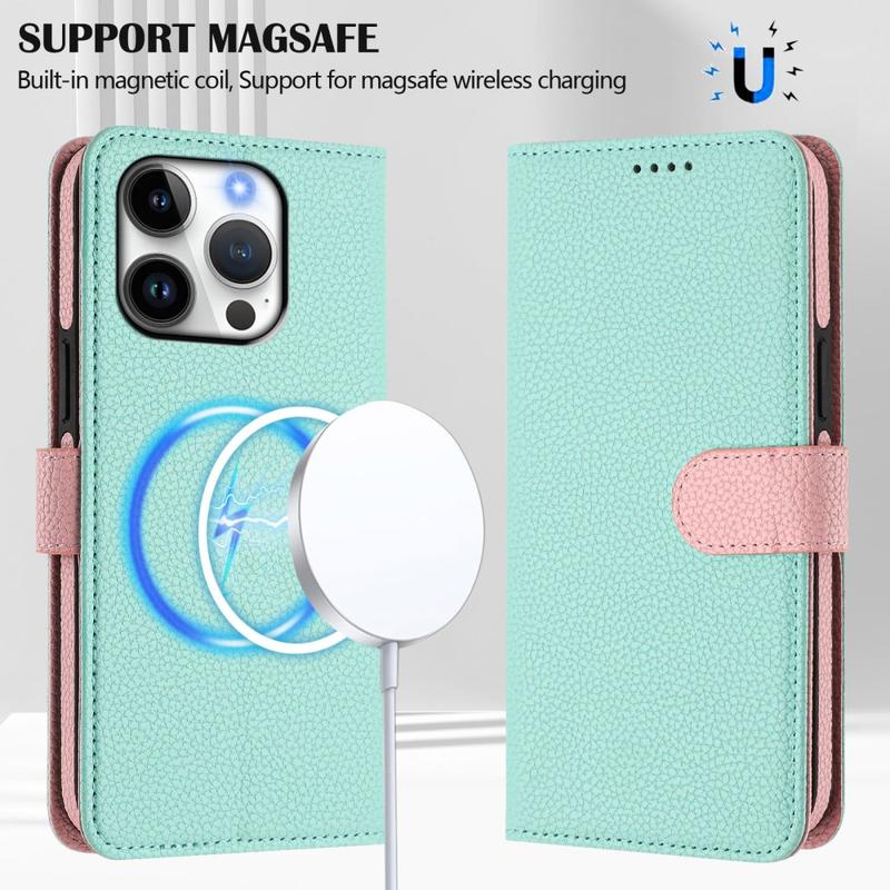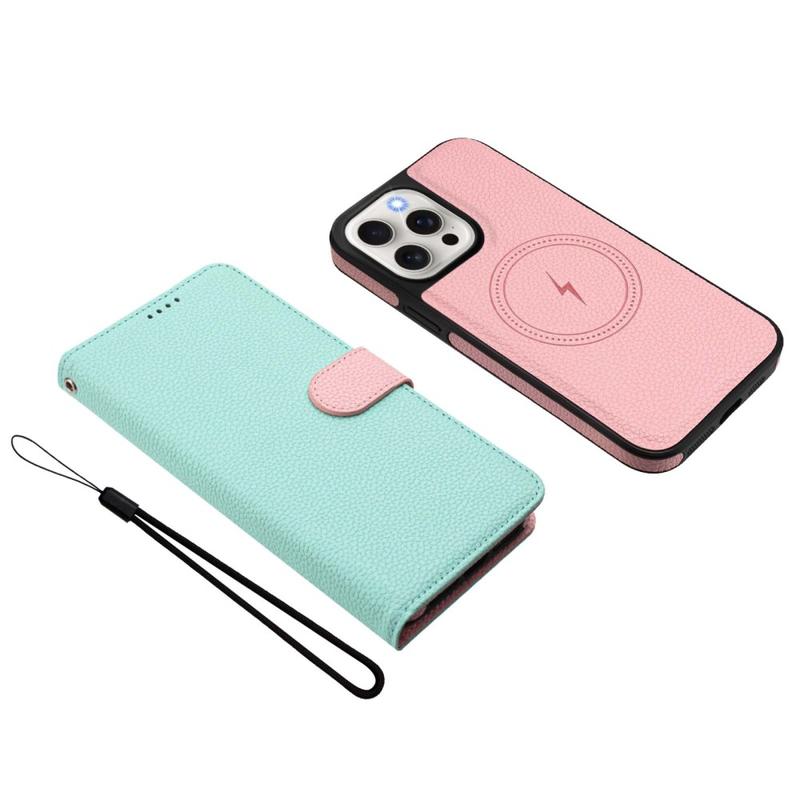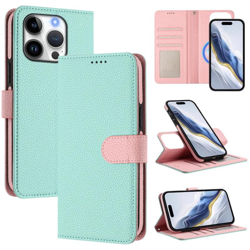 iPhone 16 Pro aftageligt pungetui med MagSafe, RFID-beskyttelse og håndrem - blå / grøn