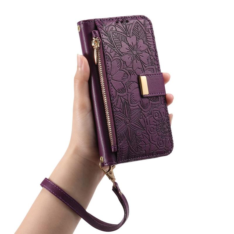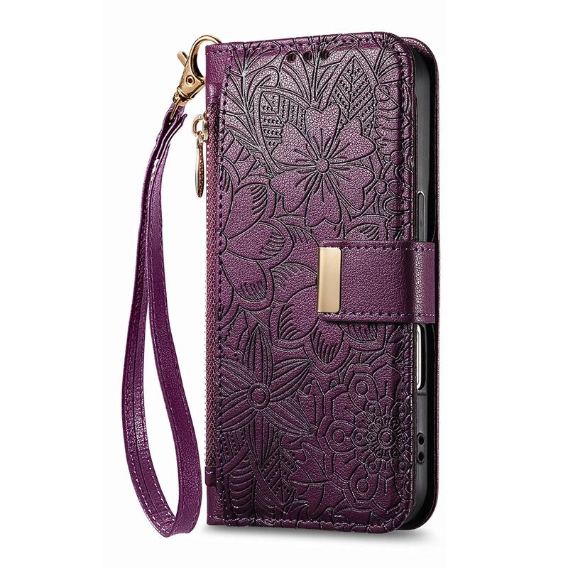 iPhone Air Pungetui med blomster- og bladmønster med lynlåslomme og håndledsrem - Lilla