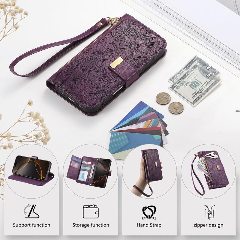 I modsætning til almindelige iPhone 16-etuier kombinerer dette alt-i-et-pungcover beskyttelse, organisering og elegance. Blomstertrykket giver det en stilfuld kant, mens lynlåslommen og håndledsremmen giver uovertruffen bekvemmelighed i hverdagen og på rejsen.