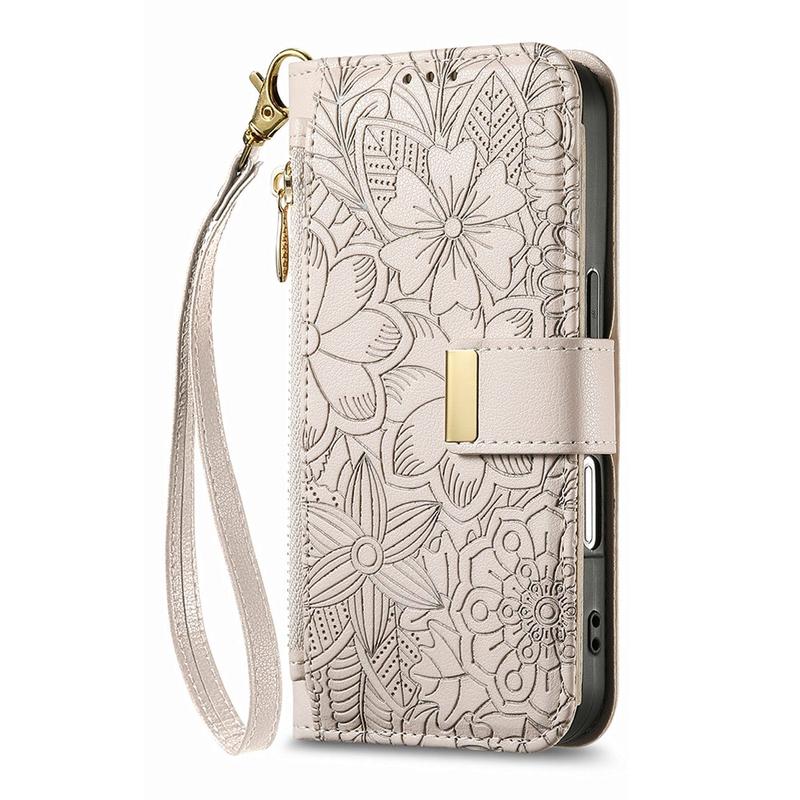 Pungetui med blomster- og bladmønster med lynlåslomme og håndledsrem til iPhone 16