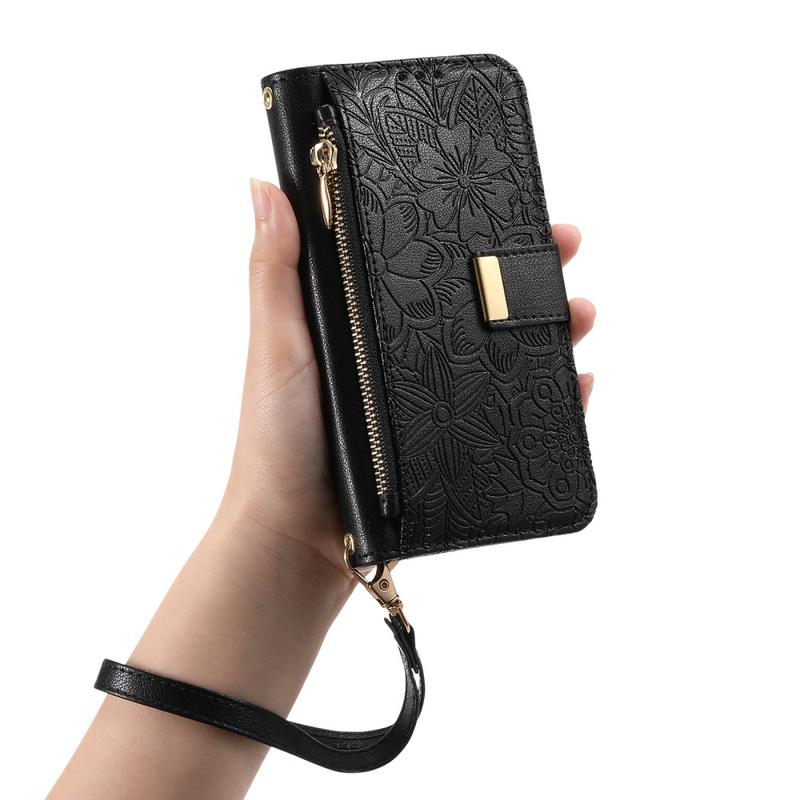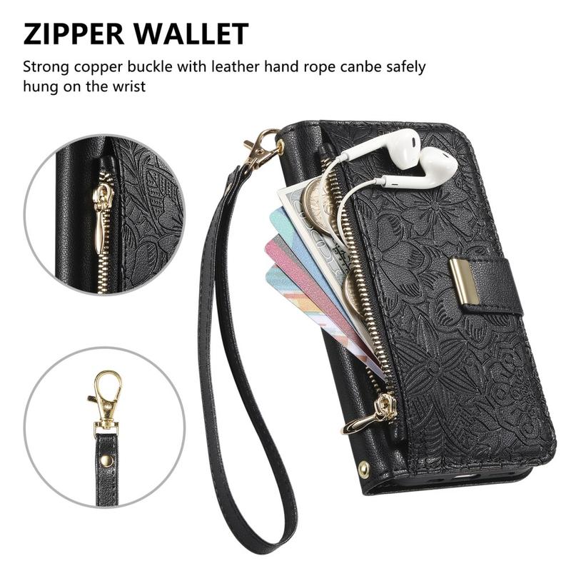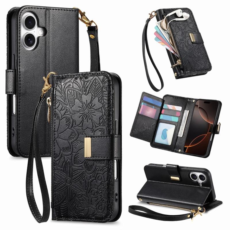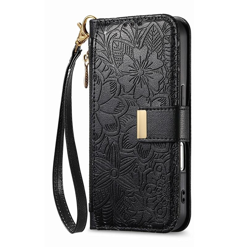 iPhone 16 Pungetui med blomster- og bladmønster med lynlåslomme og håndledsrem - Sort