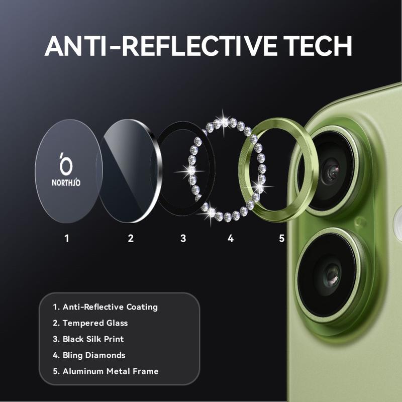 NORTHJO Rhinestone Lens Protector tilbyder det bedste fra begge verdener - førsteklasses glitter og højstyrkeholdbarhed. Det forbedrer din telefons udseende, samtidig med at det opretholder professionel fotoklarhed og hverdagsbeskyttelse.