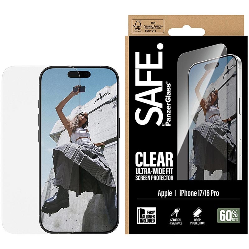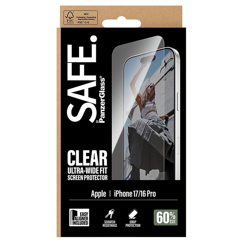 SAFE. by PanzerGlass Screen Protector til iPhone 17, iPhone 16 Pro giver overlegen beskyttelse med 60% genbrugsglas, der beskytter din enhed mod fald, ridser og stød. Den ultrabrede pasform sikrer fuld dækning og klart udsyn til skærmen, mens den fingeraftryksresistente belægning holder din skærm ren. Med 100 % berøringsfølsomhed og nem installation ved hjælp af den medfølgende EasyAligner kombinerer denne skærmbeskyttelse bæredygtighed og funktionalitet uden problemer.